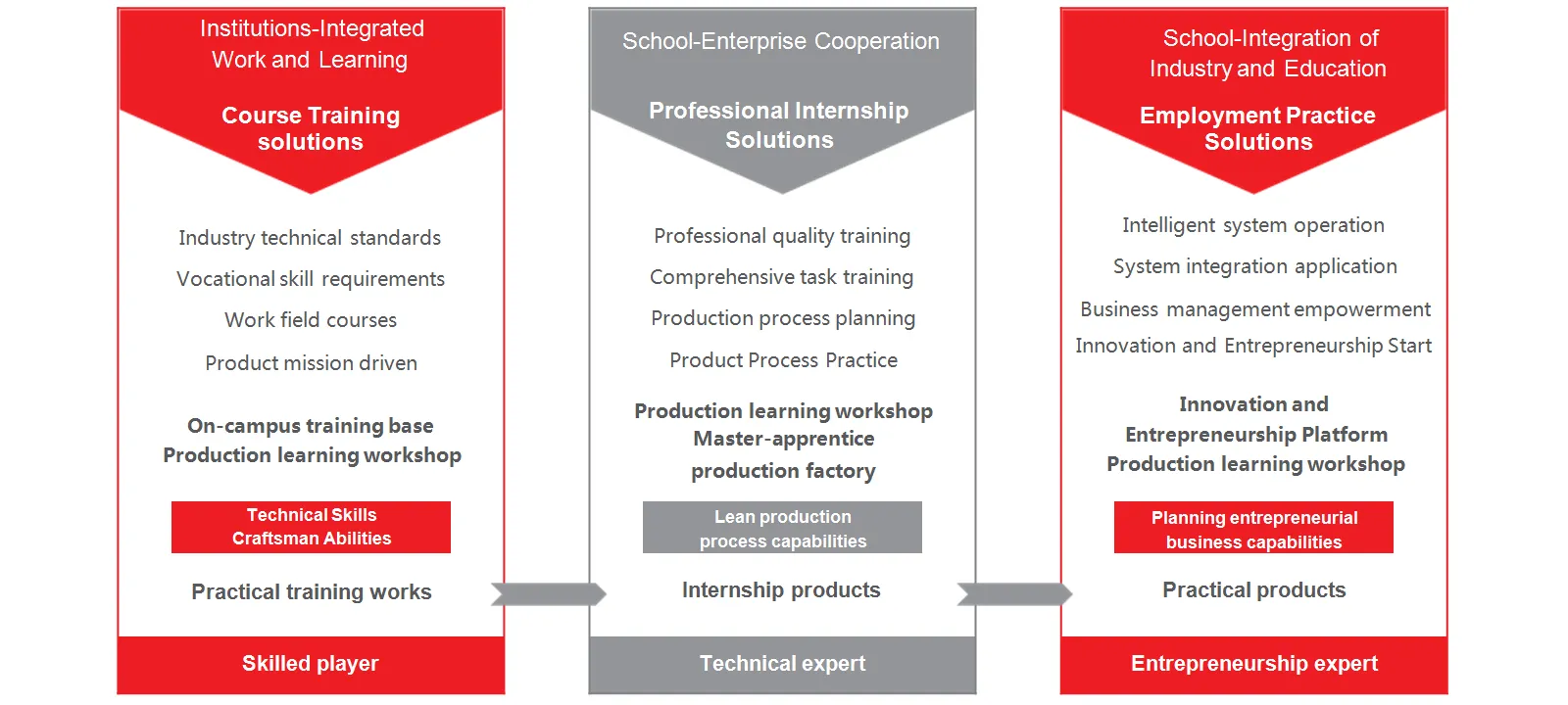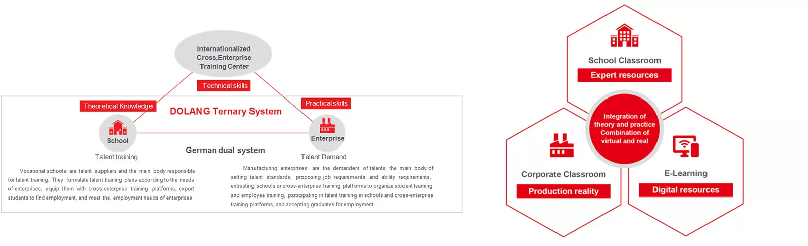 Basé sur le système allemand DIN, le groupe Dolang utilise le positionnement et les ressources de « l'école, l'entreprise, l'industrie » pour construire un « système ternaire » de cadre de coopération école-entreprise pour l'enseignement professionnel. En coopération avec les collèges et universités nationaux, nous avons co- construit des collèges industriels avec des universités et des écoles professionnelles étrangères. Les écoles industrielles créent un modèle de formation des talents de « création Dolang » basé sur la croissance des capacités professionnelles : « l'intégration industrie-éducation » est la ligne principale, grâce à la collaboration du système tripartite école, entreprise et industrie, la création et l'éducation des "travaux, produits et marchandises", et la reconstruction du système d'enseignement avancé intégré "emploi, cours, certificat, concours". Les environnements professionnels sont liés aux besoins de l'industrie, le contenu du cours est lié aux normes professionnelles et le processus d'enseignement est lié au processus de production, de manière à réaliser la croissance des capacités professionnelles des étudiants, du nouveau, de l'apprenant à l'expérimenté. , qualifiés et experts, et améliorer globalement le niveau de construction professionnelle du collège et la qualité de la formation de talents techniques et qualifiés de haute qualité.